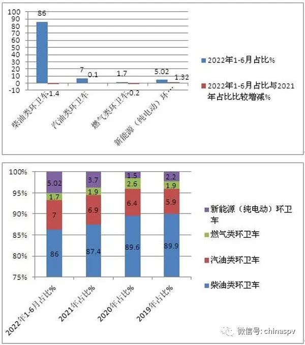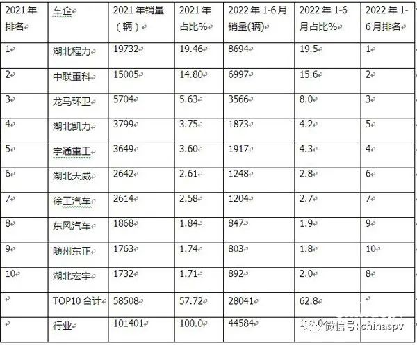2022年上半年環衛車市場趨勢:湖北程力、福建龍馬、中聯重科居前三,新能源專用汽車表現搶眼。環衛車屬于商用車行業中專用車類的一個小眾市場,包括各類垃圾車、灑水車、洗掃車、吸污車等。近年來隨著經濟的發展與人民生活水平的不斷提高,特別是近期受疫情的影響,人們對環境衛生質量的要求越來越高,同時隨著垃圾分類、城鎮化、農村環境整治等利好政策得到有效落地執行,將促進垃圾車、清掃車等環衛車輛需求呈穩定上升趨勢,因此環衛車市場已引起業內的關注。但由于受疫情影響,今年上半年環衛車市場也遭遇下滑。 根據終端上牌信息,2022年6月環衛車銷量8629輛,環比(今年5月環衛車銷量8019輛)增長7.6%,同比(去年6月銷量10385輛,見截圖1)下降16.9%,2022年1-6月環衛車累計銷售44584輛,同比(2021年前6月累計銷售54801輛)下降18.6%,累計降幅比1-5月(1-5月累計同比下降19%)縮窄近0.4個百分點。 截圖1,2021年各月環衛車銷量(數據來源:汽車智庫) 按功能用途劃分,2022年6月及前6月,環衛車中垃圾車銷量均為最多,分別銷售3133輛和累計銷售16413輛,占據環衛車的市場份額分別為36.3%和36.2%;其次是灑水車;再次是吸污車;第四是洗掃車; 在2022年6月及前6月環衛車銷量最大的垃圾車市場中,車廂可卸式垃圾車占比均超半壁江山,領跑垃圾車各細分車型銷量; 按燃料種類劃分,今年上半年柴油類環衛車仍占主體,但主體地位有減弱趨勢;新能源環衛車累計銷售2240輛,市場占比超5%,且占比比2021年增加1.32個百分點,領漲環衛車各細分市場,表現搶眼,其中新能源自卸式垃圾車累計銷售472輛,領領跑新能源環衛車各細分車型; 從今年上半年環衛車的區域市場流向看,湖北、山東、廣東居前三; 從今年上半年企業具體表現看,湖北程力、長沙中聯重科、福建龍馬環衛車居前三。 下面對今年上半年環衛車市場特點進行解讀。 特點一:按功能用途劃分,各類垃圾車銷量占比超三之一,居榜首 表1,2022年6月及1-6月各類環衛車銷量同比、占比及占比同比增減(數據來源:汽車智庫及終端上牌信息) 2022年上半年環衛車市場趨勢:湖北程力、福建龍馬、中聯重科居前三,新能源專用汽車表現搶眼。 ---各類環衛車單月和累計分別銷售3133輛和16143輛,占比分別為36.3%和36.2%,均超環衛車整體市場的三分之一份額,均居第一,說明垃圾車是環衛車中需求最多的細分車型; ---灑水車單月和累計分別銷售2261輛和11742輛,占比分別是26.2%和26.3%,均居第二; ---吸污車單月和累計分別銷售1950輛和10161輛,占比分別為22.6%和22.8%,居第三; ---清掃車單月和累計銷量分別為1285輛和6538輛,占比分別為14.89%和14.67%,居第四,是環衛車中占比相對較小的細分車型。 總之,無論是今年6月還是今年上半年,垃圾車占比均超三分之一,成為環衛車中占比最高、最受市場青睞的細分車型。 特點二:車廂可卸式垃圾車占比超半壁江山,領跑垃圾車市場 表2,根據終端上牌信息,2022年6月及前6月各類垃圾車銷量、占比統計: 上表可見,2022年6月及1-6月各類垃圾車銷量及占比呈現以下特點: ---車廂可自卸式垃圾車單月及累計銷量分別為1660輛和8158輛,占比分別為50.1%和50.5%,占比均超半壁江山,均居第一,領跑各類垃圾車市場,說明車廂可卸式垃圾車最受垃圾車市場歡迎; ---壓縮式垃圾車單月和累計銷量分別為1098輛和5688輛,占比分別為35.1%和35.2%,均居第二; ---密封式垃圾車和拉臂式垃圾車無論是單月和累計銷量占比均很小; ---其他垃圾車單月和累計銷量分別為395輛和2005輛,主要包括各種倉廚垃圾車、掛桶式垃圾車等,占比分別為12.6%和12.5%。 特點三:新能源環衛車占比增加最多,表現搶眼 截圖2,2019年—2021年各類動力環衛車銷量占比(來源:汽車智庫平臺) 表3,根據終端上牌及汽車智庫平臺數據,按動力燃料種類劃分,2022年上半年各類環衛車銷量及占比統計: 上圖表可見,按動力中了劃分,在今年上半年的環衛車銷量結構中: ---柴油類環衛車累計銷售38342輛,占比86%,仍然占據絕對的霸主地位,但占比與2021年比減少1.4個百分點,與2020年、2019年比減少更多,可見近年來柴油動力環衛車占比有逐年減少的趨勢; ---汽油動力環衛車占比7%,居第二,且與近年比有微弱增長的跡象; ---新能源環衛車(幾乎都是純電動類)累計銷售2240輛,占比5.02%,與2021年比占比增加1.32個百分點,是占比增加最多的細分車型,與2020年和2019年比增加更多,說明目前新能源環衛車增長的勢頭最為強勁。這主要得益于國家雙碳戰略的持續發力。 表4,另外根據終端上牌信息,2022年上半年新能源環衛車最暢銷的top5車型: 上表可見,在今年上半年新能源環衛車銷量TOP5車型中,新能源自卸式垃圾車銷量占比21.1%,居第一,其次是新能源洗掃車,占比20%;再次是新能源清洗車,占比19.3%;top5累計占比82.8%,占據了新能源環衛車市場的壟斷地位。 總之,在今年上半年各類動力的環衛車市場份額變化中,新能源增加最多,表現亮眼。 特點四:湖北、山東、廣東居前三;TOP10市場集中度提高 表5,根據終端上牌信息,2022年1-6月環衛車流向區域市場top10統計: 上表可見,在2022年1-6月環衛車銷量區域分布中,TOP10區域呈現以下特點: ---湖北銷量6776輛,占比15.2%,居第一,且與2021年比占比增加3.07個百分點,強者更強,表現突出; ---山東銷量3834輛,占比8.6%,位居第二,且占比與2021年比增加0.1個部分; ---廣東銷量3478輛,占比7.8%,位居第三,但占比與2021年下降1.7個百分點; ---