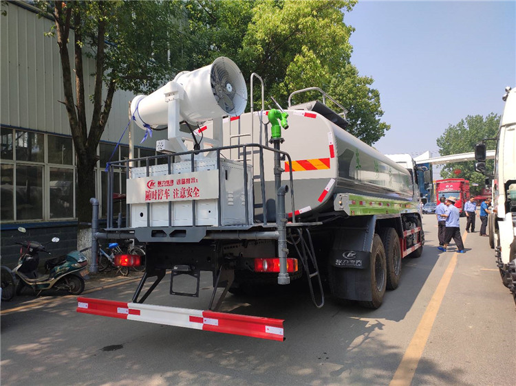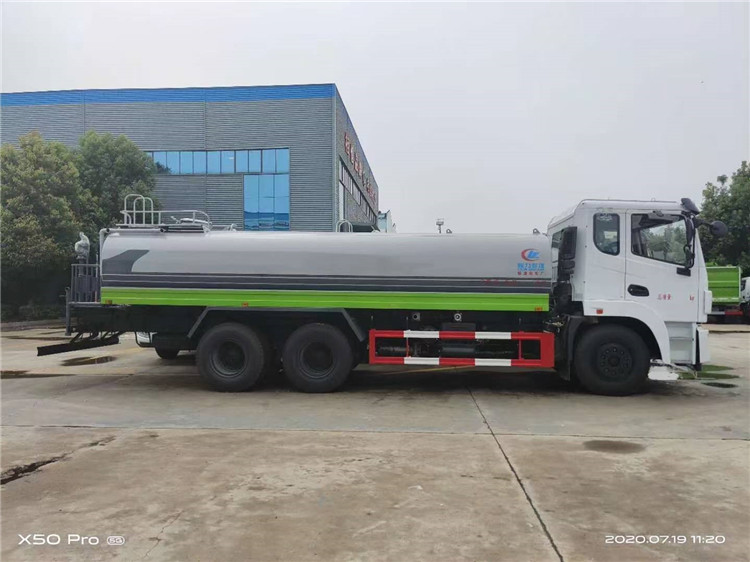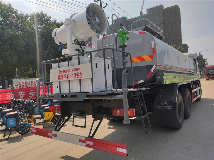 湖北程力國六東風錦程V6后雙橋18噸灑水車程力威牌CLW5253GPSD6型綠化噴灑車廠家配置: | 湖北程力國六東風錦程V6后雙橋18噸灑水車底盤配置:采用東風后雙橋原裝底盤,東風錦程齊星軍工V6四點懸浮駕駛室,4350+1350mm軸距,搭載國六(國Ⅵ)東風康明斯230/260馬力柴油發動機,功率169/191kw,國六排放,陜齒法士特八檔變速箱,11.00R20鋼絲胎,前橋5T,后橋雙10T,方向助力,斷氣剎,排氣制動,原裝空調,行駛記錄儀,多媒體顯示屏,電動門窗,中控鎖,氣囊座椅,ABS。湖北程力國六東風錦程V6后雙橋18噸灑水車專用配置:罐體容積:19立方米,罐體鋼板為4mm碳鋼Q235材質專用容積板一次成型,罐內隔板具有防波作用,以減輕汽車行駛時罐體液體沖擊;配大功率專用灑水泵,泵可自吸自排;整車前沖、后灑、側噴、后平臺帶綠化灑水炮,灑水炮可全方位旋轉,可連續調成直沖狀、大雨、小雨、毛毛雨;前封頭帶水位計,后平臺主管路帶1寸澆花接口,后爬梯,帶1個消防接頭,帶1個自流閥,1個過濾裝置。湖北程力國六東風錦程V6后雙橋18噸灑水車選裝配置:1、可選裝氣動球閥開關駕駛室內控制; 2、可選裝后平臺帶CLW-30、40型霧炮機組